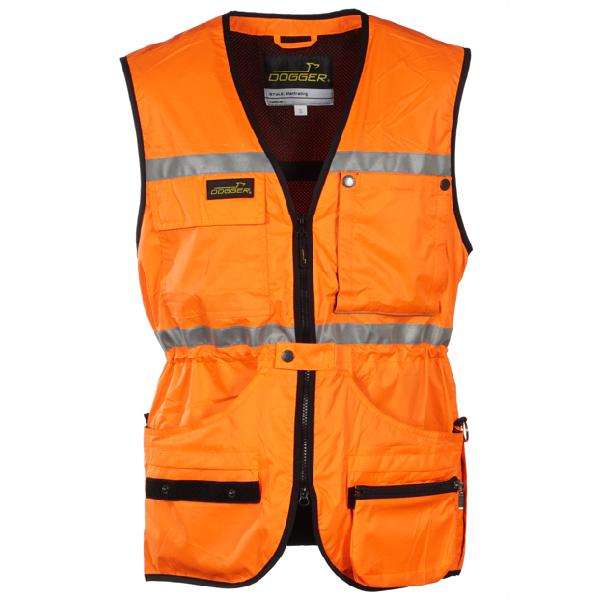 Ce gilet de sécurité est d’une couleur orange très voyante et muni de deux rangées de bandes réfléchissantes sur tout son pourtour.