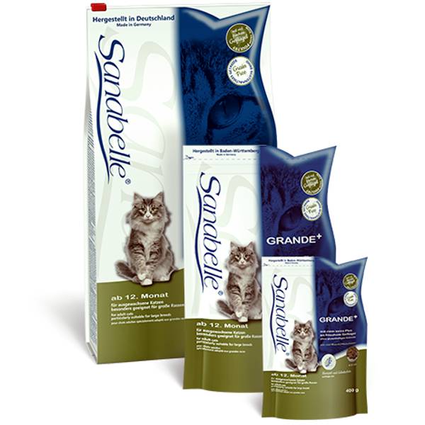 Sanabelle Grande, avec un supplément de volaille fraîche (min. 20%) et fabriqué sans céréales contenant du gluten, a été développé spécifiquement pour les grands chats race adultes.